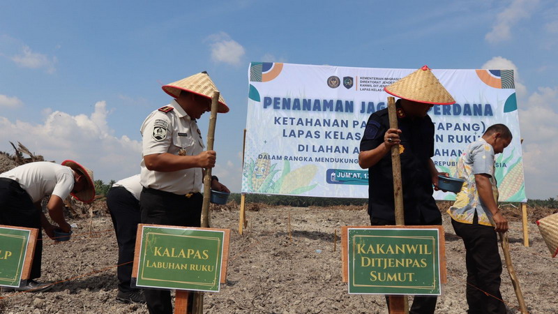 Batubara – Penanaman jagung perdana digelar di Lahan Air Joman sebagai langkah nyata optimalisasi lahan produktif di wilayah Sumatera Utara, Jum’at(13/2). Kegiatan ini dihadiri langsung oleh Kepala Kantor Wilayah Direktorat Jenderal Pemasyarakatan Sumatera Utara Yudi Suseno, Wakil Bupati Asahan, Kalapas Tanjung Balai Asahan, Kalapas Labuhan Ruku, Pejabat struktural dan Staf Lapas Labuhan Ruku. Penanaman dilakukan sebagai tanda dimulainya pengelolaan lahan pertanian secara berkelanjutan.